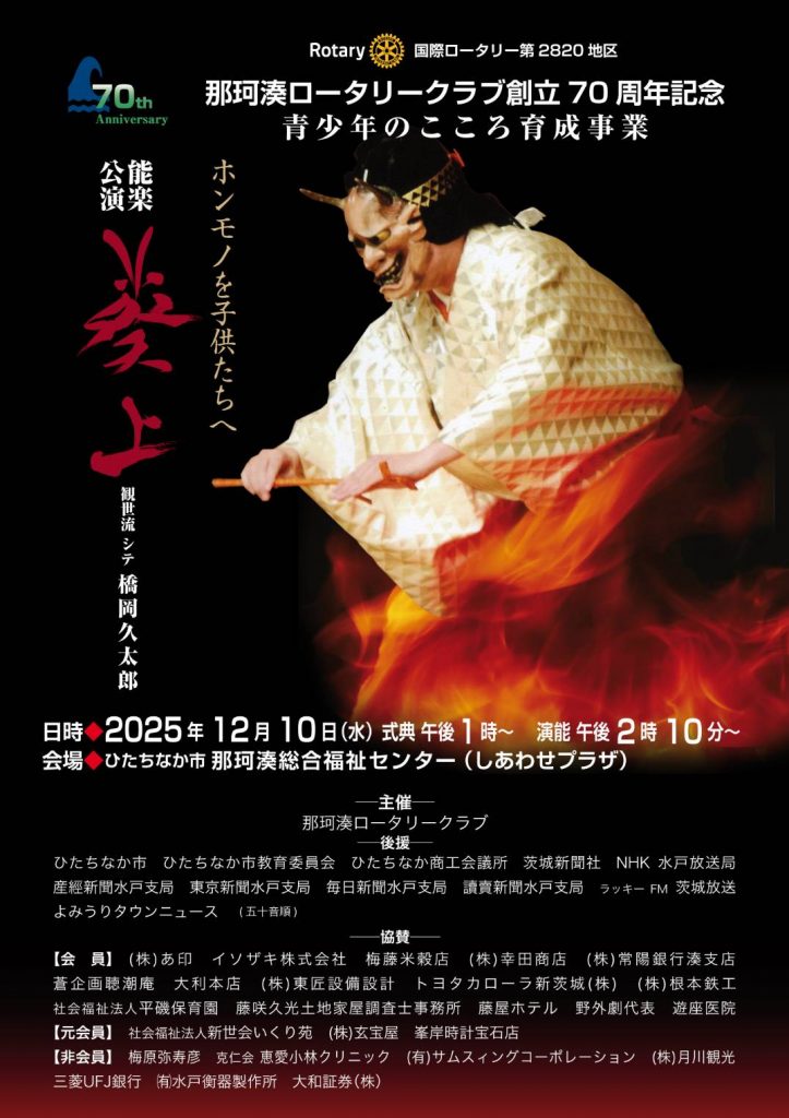那珂湊ロータリークラブは今年度創立70周年という大きな節目を迎えます。その記念として、従来から取り組んでおります「青少年のこころ育成事業」を継続遂行する運びとなりました。事業内容は、かねてより、実現に向けて模索しておりました「能楽」を佐倉中央ロータリークラブ所属でロータリーコーディネーターでもあります無形文化財能楽師・橋岡久太郎先生に御無理を申し上げ、演目『葵上』催行の運びとなりました。當に至上の歓びでございます。地域の子供達をホンモノの世界に誘うことで、何か大きな感動をこころ(・・・)に刻んでもらいたい、そう願って止みません。「感動に打たれてこそ人は尋常ならざることを深く感ずるのである…」ゲーテでございます。